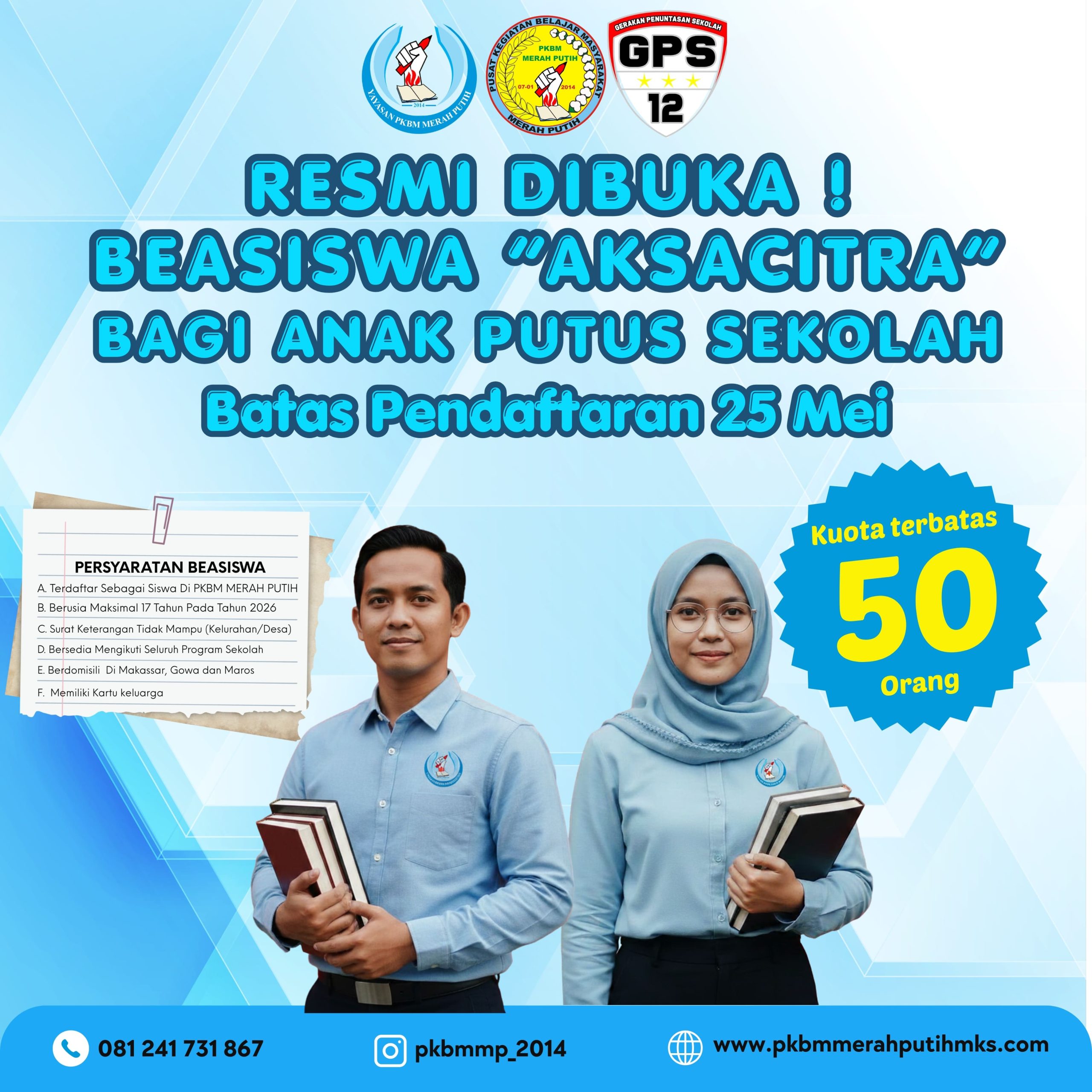 Pendaftaran Beasiswa Aksacitra akan ditutup pada 25 Mei 2026. Informasi lebih lanjut serta proses pendaftaran dapat dilakukan dengan menghubungi Admin PKBM Merah Putih melalui WhatsApp di nomor 081241731867.